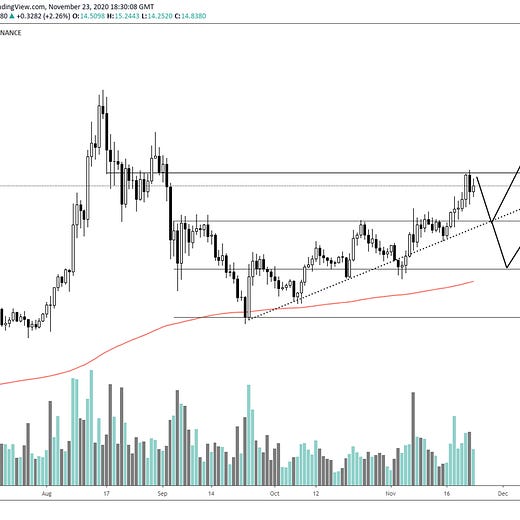 If BTC now goes sideways for several months in the $17,000-$20,000 range, we might see LINK get a good bounce off the top trendline and test ATHs or perhaps an over-correction going below the bottom trendline before it continues up.
