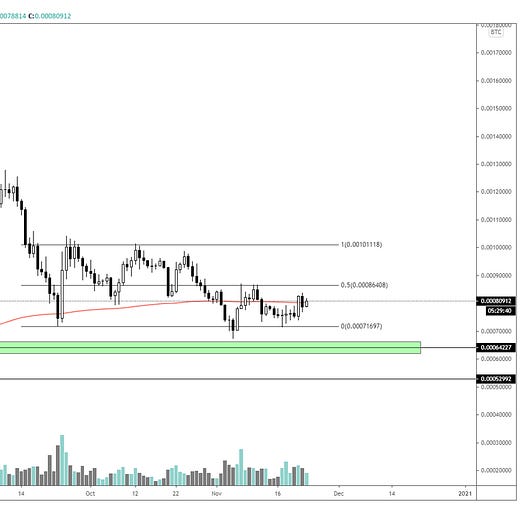 FUND 3 started last week, November 16, 2020, with $1000 USD in value and invested into BTC, LTC, ETH and ADA. The BTC value is up 10%, and against USD, it is up 21%. We will hold these positions to see how well it does against our BTC-only portfolios. LTC was almost trading at yearly lows when bought, and now it is at the top of its bearish trendline; if LTC can breakout, we should see some good movement upwards. ETH bounced nicely off the bottom and continued to break the top of the trendline for a gain of 17% BTC and 28% USD. ADA has done the best this week for a gain of 31% BTC and 45% USD.